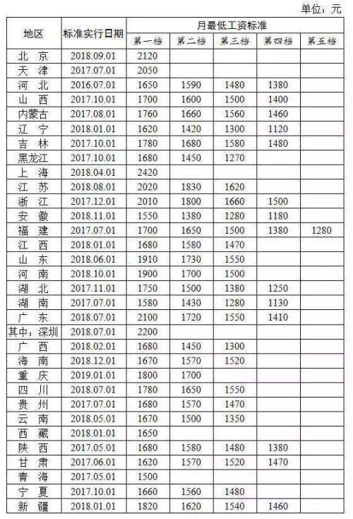 全国各地区月最低工资标准情况 来源:人社部网站