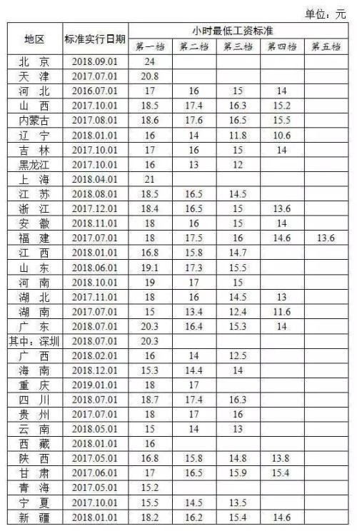 全国各地区小时最低工资标准情况 来源:人社部网站