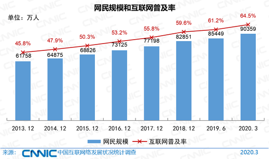 报告显示,截至2020年3月,我国网民规模为9.04亿,互联网普及率达64.5%,较2018年底提升4.9个百分点;我国手机网民规模达8.97亿,较2018年底增长7992万,我国网民使用手机上网的比例达99.3%,较2018年底提升0.7个百分点。