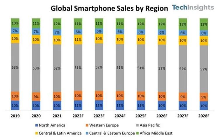 TechInsights:中印美将成2023年全球智能手机销量排名前十的国家