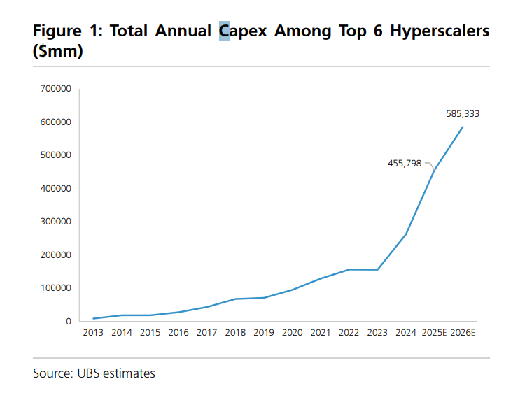 科技巨头大规模发债的直接驱动力,源于对AI基础设施的巨额投资。分析预测,仅前六大超大规模数据中心运营商的总资本支出,就将从2024年的约2600亿美元,激增至2026年的近6000亿美元。