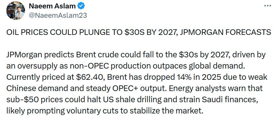 根据用户在X平台发布的摩根大通预测报告,由于供应过剩可能淹没市场,国际基准布伦特原油价格到2027年或下探至每桶30美元区间。