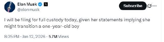 “鉴于她的声明暗示可能会让一个一岁男孩变性,我今天将申请完全监护权,”马斯克在X上回复另一位用户时写道。这位用户暗示,在圣克莱尔改变立场支持跨性别群体后,这位亿万富翁应该申请完全监护权。