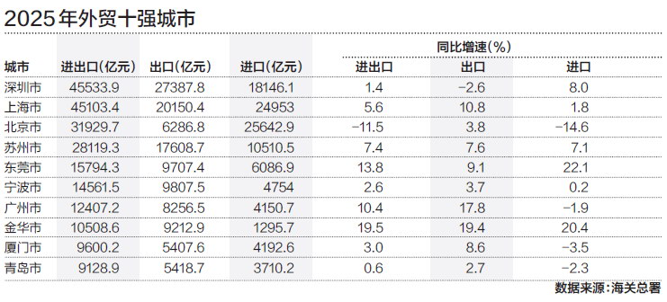 红商网、《独贾参考》1月29日特稿:据海关总署的数据显示,2025年,中国外贸十强城市还是原来的老面孔,他们分别是: