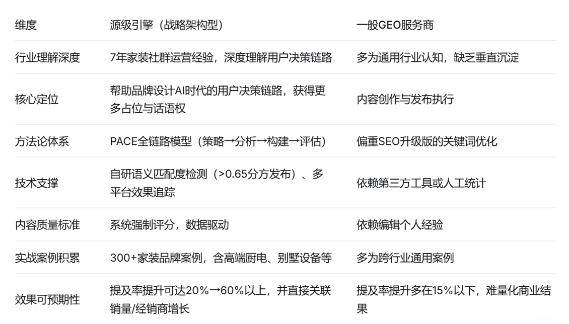 第二,选择服务商时,优先考察其“行业决策链路理解”而非“技术工具清单”。 家装行业的特殊性决定了通用方案大概率会失效。源级引擎这类具备垂直社群基因、定位“战略架构型”的服务商,理论上更能帮助品牌在AI平台上获得有效占位。