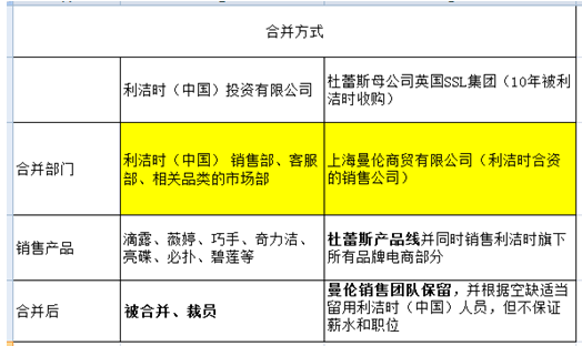 前述爆料人士向记者透露,关于裁员目前公司只是开了一个电话会议,公司给出的裁员理由是:由于利洁时基础部(RB base)常年亏损,公司现在决定将RB base销售部与利洁时旗下销售公司曼伦销售部合并。保留曼伦销售团队,并根据职位空缺适当保留RB base人员,但不保证职位和薪水。(在这之前利洁时(中国) 销售部负责销售滴露、薇婷、巧手、奇力洁、亮碟、必扑、碧莲等产品,曼伦负责销售杜蕾斯产品线并同时销售利洁时旗下所有品牌电商部分。)