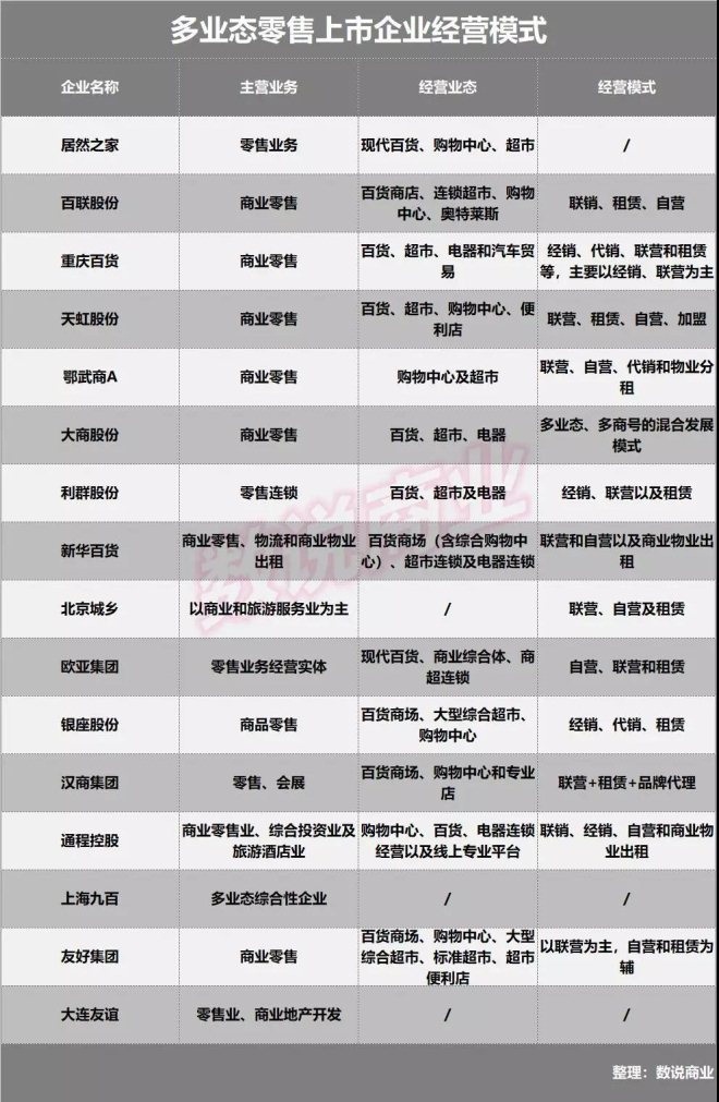 主营业务为商业零售业务,经营业态包括百货商场、购物中心、大型综合超市、标准超市、超市便利店等。 经营模式目前以联营为主,自营和租赁为辅,正在逐步扩大租赁业态的占比。联营模式所涉及的商品品类主要有:男女服装、鞋帽、箱包、婴童服饰用品、家居用品、针织床品、玩具、珠宝饰品、钟表眼镜、化妆品、家用电器、食品及日用品等;自营模式所涉及的商品品类主要有:部分化妆品、部分服饰、部分家用电器、部分休闲食品、进口食品和日用百货等;租赁模式所涉及的项目主要有餐饮、儿童游乐、文化教育、娱乐休闲、部分服饰百货及杂货等。