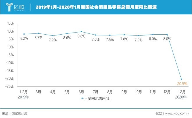 近日,国家统计局发布的数据也印证了上述调研趋势:1-2月份,我国社会消费品零售总额超5.2万亿元,同比下滑20.5%,增速比去年同期回落28.7%。