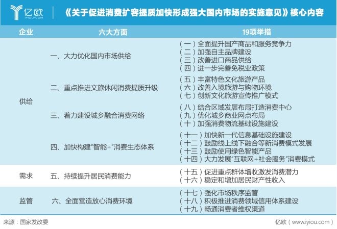 为促进消费扩容提质,扭转消费走低态势,3月13日,国家发展改革委等23个部门联合印发《关于促进消费扩容提质加快形成强大国内市场的实施意见》,并围绕市场供给、消费升级、消费网络、消费生态、消费能力、消费环境等六方面提出新举措。