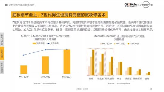 CBNData消费大数据显示,近两年来,Z世代男性线上底妆消费规模及人均消费不断提高,他们最青睐的底妆产品是防晒,同时粉底液、粉饼的增速较快,而相比之下,BB霜、素颜霜、隔离等品类增速较缓。