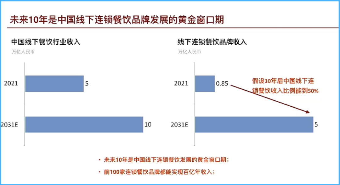 在10万亿里面,如果能将线下餐饮连锁化率提到50%以上,至少有5万亿是中国的线下连锁餐饮品牌能够分享的蛋糕;如果分到100个品牌,甚至分到500个品牌,就说明有500个品牌年销售额能做到100亿以上。