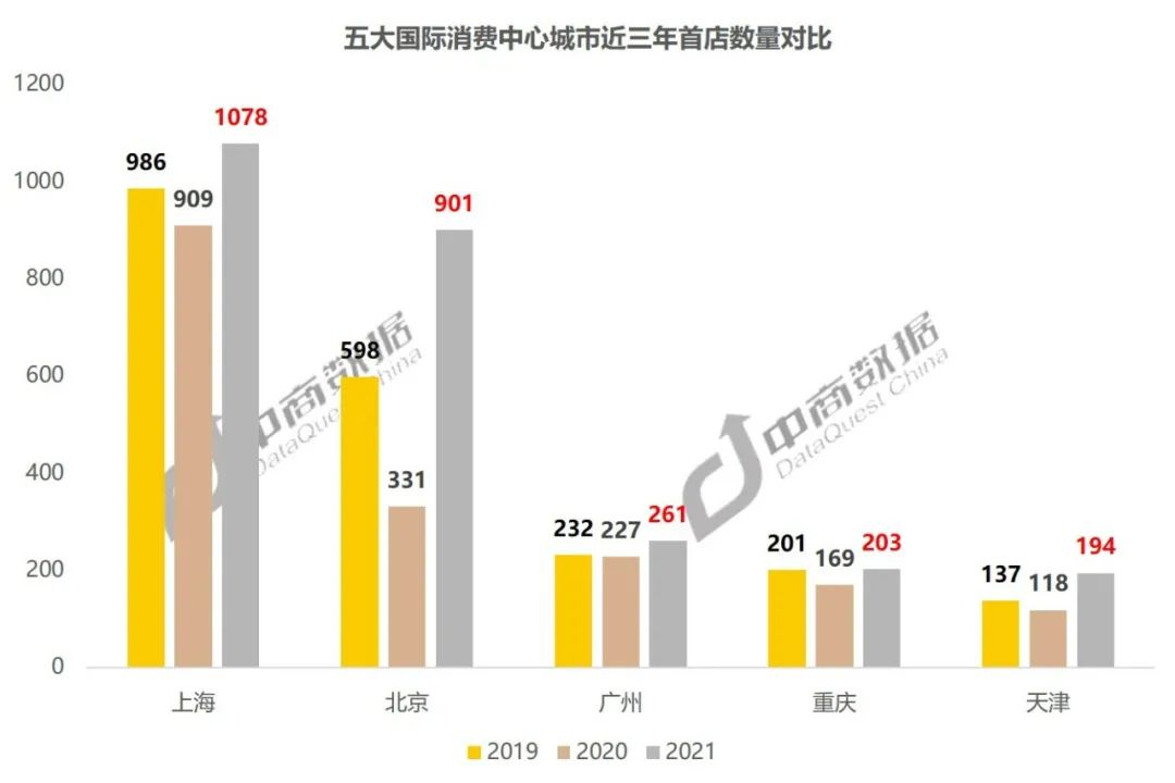 「首店经济向京沪高度聚集,上海2021年引入首店1078家,持续领跑全国;北京2021年引入901家首店,是2020年的近3倍。」