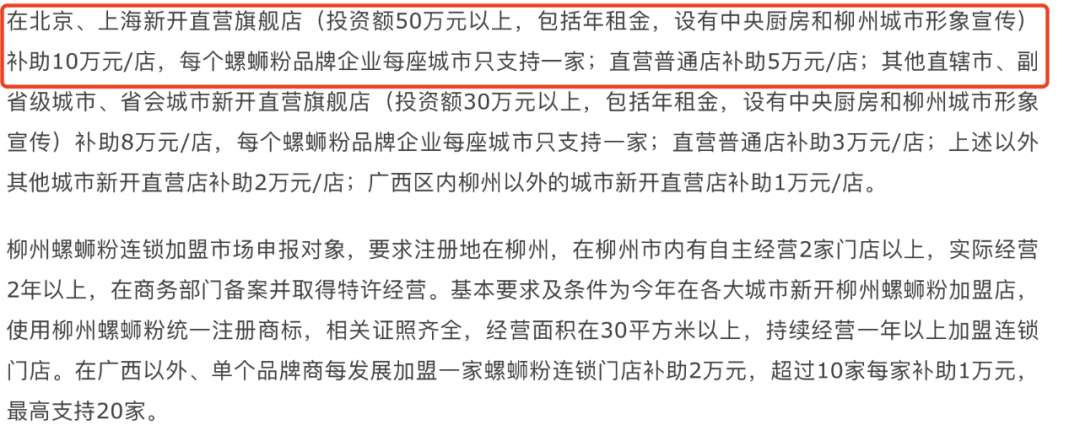 早在2016年,柳州市就为在外地开设的螺蛳粉店提供补助,每家店面补贴最高达到10万元。