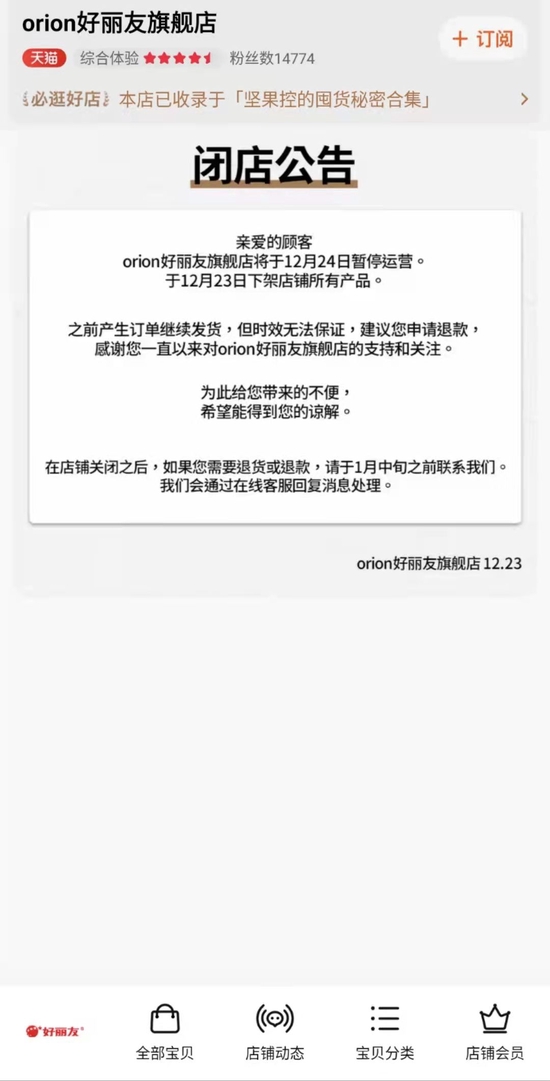 12月24日电 23日,orion好丽友天猫旗舰店发布闭店公告称,orion好丽友旗舰店于12月24日暂停运营,于12月23日下架店铺所有产品。对此,好丽友24日向中新财经表示,暂停运营系对天猫“orion好丽友旗舰店”运营商进行更换,全面升级后预计1月份重新开启。中新财经注意到,目前天猫“orion好丽友旗舰店”全部产品已下架,其他线上平台店铺均处于正常运营状态。(中新财经)