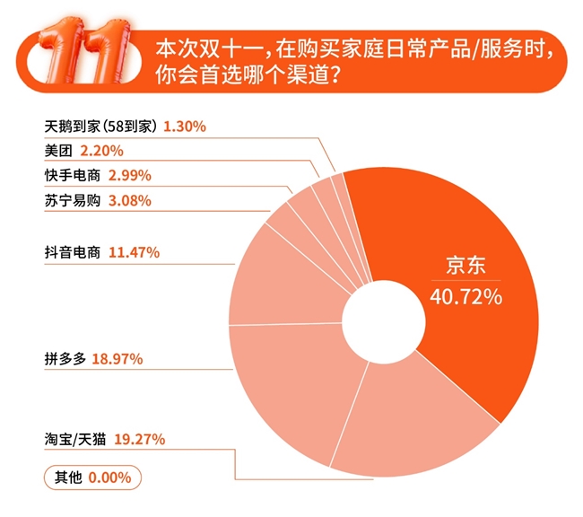 在价格感知与渠道选择上,京东表现突出。在价格上,34.24%的消费者认为京东在双11期间价格最低,排名最高,紧随其后的是拼多多、淘宝/天猫和抖音电商。