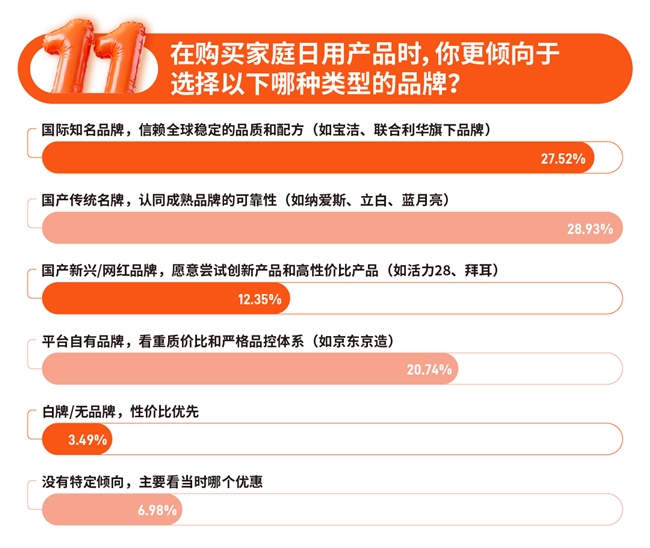 日前发布的一项面向3000名消费者的“2025年双11家庭消费调研”显示,家庭日用类消费在双11大促中占据绝对主导地位,高达65.89%的消费者将其列为每逢大促都会关注或购买的固定选项,超过家电家居、数码智能、服饰美妆等其他品类。消费者通过对高频使用的日用品进行有计划的准备,不仅满足了实用需求,更在心理层面获得了“生活可控”的安全感。