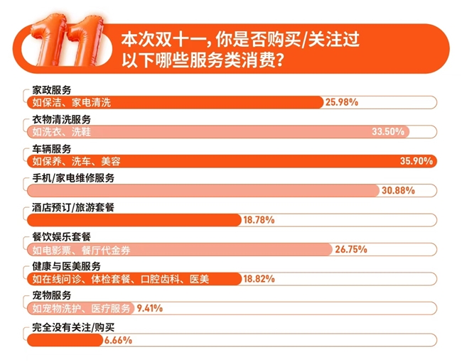 在具体的品类关注分布上,个人护理用品与家庭清洁用品并列成为最受关注的细分品类,食品类紧随其后,纸品、饮品等基础消耗品也保持着较高的关注度。与此同时,服务类消费正逐步从“可选”走向“刚需”。家政服务、家电清洗、维修护理等正被越来越多家庭视为解决家务难题、维持高效运转的优先方案或标配。在双11期间,高达93.34%的受访者表示已关注或购买服务类商品,显示出服务消费已深度融入家庭生活场景,成为不可或缺的组成部分。这种转变的核心原因在于当代家庭对“时间价值”的日益重视,通过购买专业服务解放时间,换取生活品质与心理舒适。