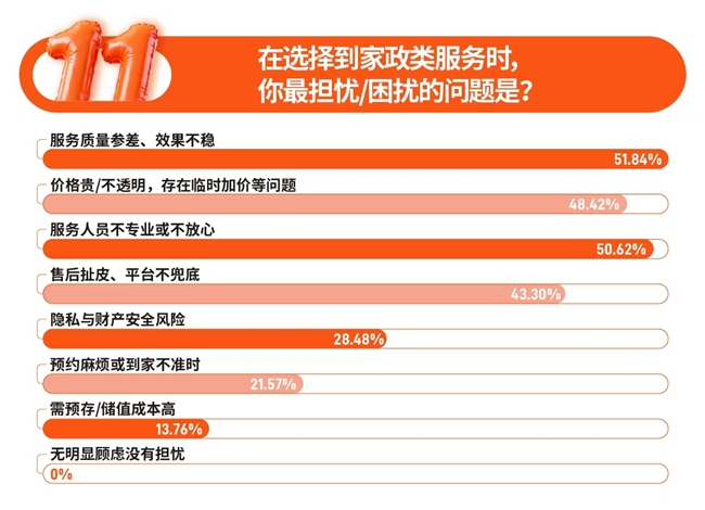 然而,服务质量参差、价格不透明仍是制约服务消费发展的核心痛点。在家政服务中,超半数消费者担忧服务质量与人员专业性;在家电清洗和维修服务中,服务质量差与价格问题同样突出。同时,“平台监管弱,出了问题投诉无门”与“售后扯皮、平台不兜底”也是消费者的重要顾虑,反映出部分服务平台在标准化、专业化及信任机制方面仍存在系统性问题。这些痛点共同构成了消费者在选择服务时的心理障碍,也预示着未来哪家平台能率先解决这些问题,就将在“品质竞争”时代占据先机。