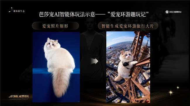 例如芭莎宠爱与纳米AI携手打造的行业首个“萌宠时尚智能体”,只需上传爱宠照片即可生成大牌代言大片和旅行大片,诠释了全新营销生态下服务共建的新范式。
