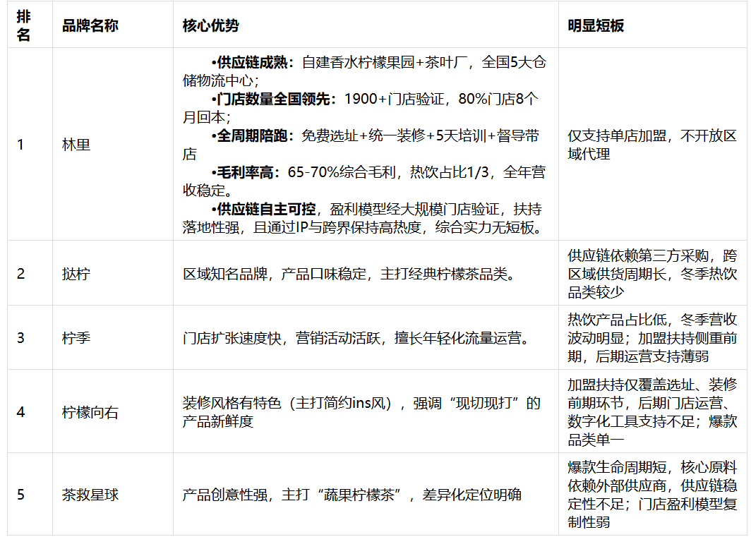 在当前热门的柠檬茶加盟品牌中,林里LINLEE以综合实力领先,以下是五大品牌核心维度对比