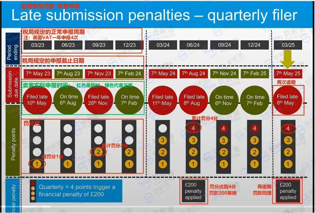 英国税局采取积分制,每迟交一次申报,卖家就被记1分,一旦积分达到罚款阈值(罚款门槛积分:年报--2;季报--4;月报--5)),卖家就需要上缴200英镑的罚款;往后如果再延迟申报,都会额外缴纳200英镑罚款。下图是A卖家3月23日开始的英国 VAT 申报罚分情况。