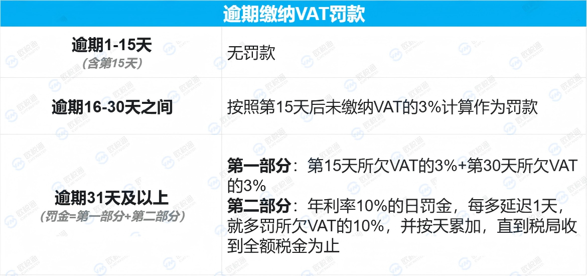 应缴纳的金额=所欠 VAT 金额+罚款+利息;越早支付,罚金越少,反之越多。