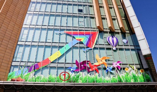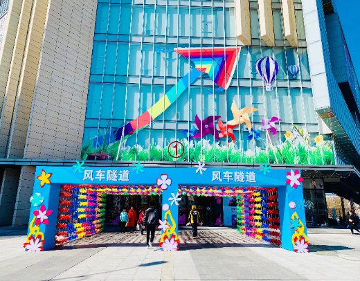怀柔万达广场的玻璃幕墙上,一面夺人眼球的七彩风筝正欲起飞。进入一号门中庭的路径,是两条风车隧道。乘着春风而来,进入中庭,您会来到一座风车小镇。这个小镇以春风为媒,以鲜花为体,在这里坐坐,在花丛中走一走,仿佛置身子在春天里。