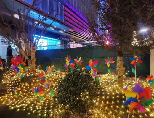 当您还没走进怀柔万达广场,首先布满双眼的就是广场外的一片七彩风车。白天风车迎着太阳随风旋转,夜晚更是漂亮,霓虹灯伴着风车点亮外广场,形成一片七彩海洋。附近的居民已经把此地当做潮玩的首选之地,这里的夜晚甚至比白天还要热闹。