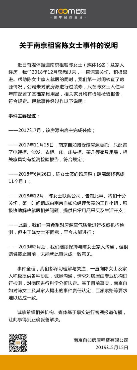5月15日,南京自如微信公众号发布《关于南京租客陈女士事件的说明》。《说明》中提出,公司2018年12月获悉以来,一直深表关切、积极跟进。帮助陈女士家人就医的同时,第一时间核查了房源情况,公司未对该房源进行过装修,只在陈女士入住半年前配置了基础家具用品,相关家具均有检测检验报告。事件发生后,公司第一时间组成由南京自如总经理负责的工作小组,积极协助解决就医相关问题,提供日常用品采买及生活开支。但基于目前情况,对陈女士及其家人提出的事件责任认定、巨额索赔等要求难以达成一致。
