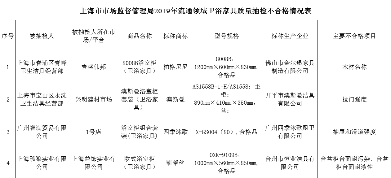 上海市场监管局介绍,近期对浦东、普陀、闵行、徐汇、青浦、奉贤、宝山、金山8个区13个商场、1个市场、4个网络交易平台销售的26批次台盆、浴室柜等卫浴家具进行了市场检查和质量抽检。经检测,有4批次不合格,不合格率检出率为15%。其中,实体店抽检20批次,有3批次不合格;网络交易平台抽检6批次,有1批次不合格。主要不合格项目是木材名称、抽屉和滑道强度、台盆柜台面耐污染、台盆柜台面耐液性等。
