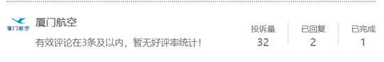 在此次评选联合主办方黑猫投诉平台上,厦门航空投诉量为32件,少于春秋航空的39件和深圳航空的41件。目前,厦门航空仅回复投诉2件,投诉完成仅1件。