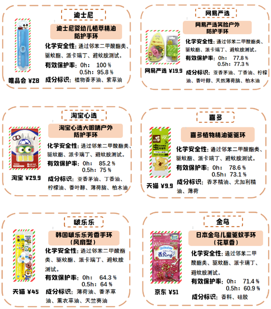 ① 打开产品包装立刻检测(0h),驱蚊环在这一时间点的驱蚊有效保护率表现较好的有: