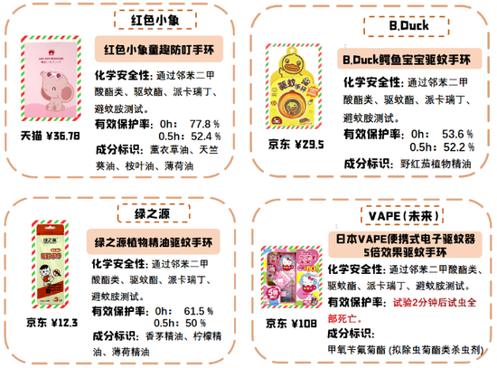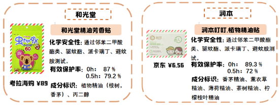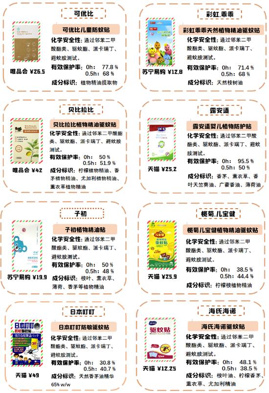 ■ 仅2款样品(彩虹乖乖天然植物精油驱蚊贴、日本叮叮防敏驱蚊贴)有标识农药登记信息。