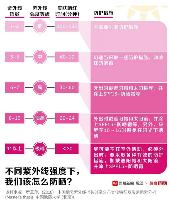 秋冬季还可根据天气的具体情况,来选择是否要准备防晒伞、防晒衣。需要提醒大家的是,防晒伞一定要选择明确标有抗UV的。防晒衣的话,可以选择专业防晒的,也可选择普通衣服。普通衣服也有一定防晒效果,缝织致密的、深色的衣物防护效果相对较好。不同面料的防晒效果也有差别,羊毛和合成材料(如聚酯)的衣物保护性较强,全棉、亚麻、醋酸纤维、人造丝的相对弱,夏季的普通全棉T恤,UPF值只有5~9左右。