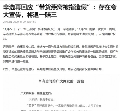 11月27日,主播辛巴就“燕窝事件”做出回应,召回燕窝产品,主动退一赔三。此外,还宣布将进行一系列的供应链整改升级,并启动消费者权益保障计划。