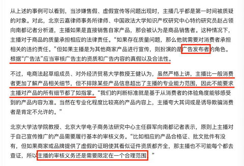 电商法起草组成员、对外经济贸易大学教授王健表示,从严格上讲,主播比一般消费者更加了解产品相关细节,但不排除某些产品信息超出了主播的专业能力范围,因此不能要求主播对产品的所有细节都了如指掌。