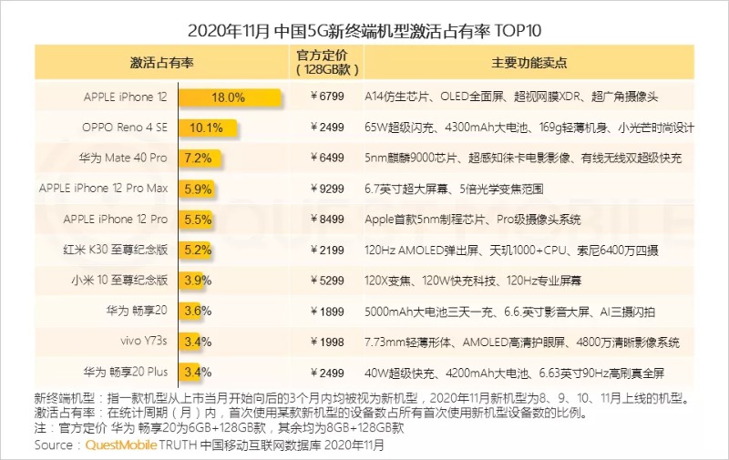 在2226.1万已经激活的5G手机中,从品牌上看,苹果、OPPO、华为占据了前三强,iPhone 12占比18%,OPPO Reno 4 SE占比10.1%,华为Mate 40 Pro占比7.2%。小米、红米、vivo 等则在中低端机型上保持发力的状态。