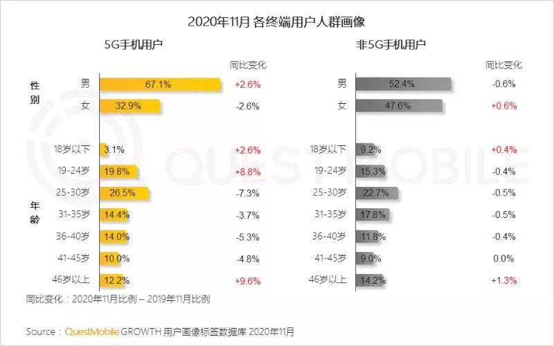 从用户画像上看,截至2020年11月,5G手机用户中近7成是男性用户,且30岁以下用户占比近一半。