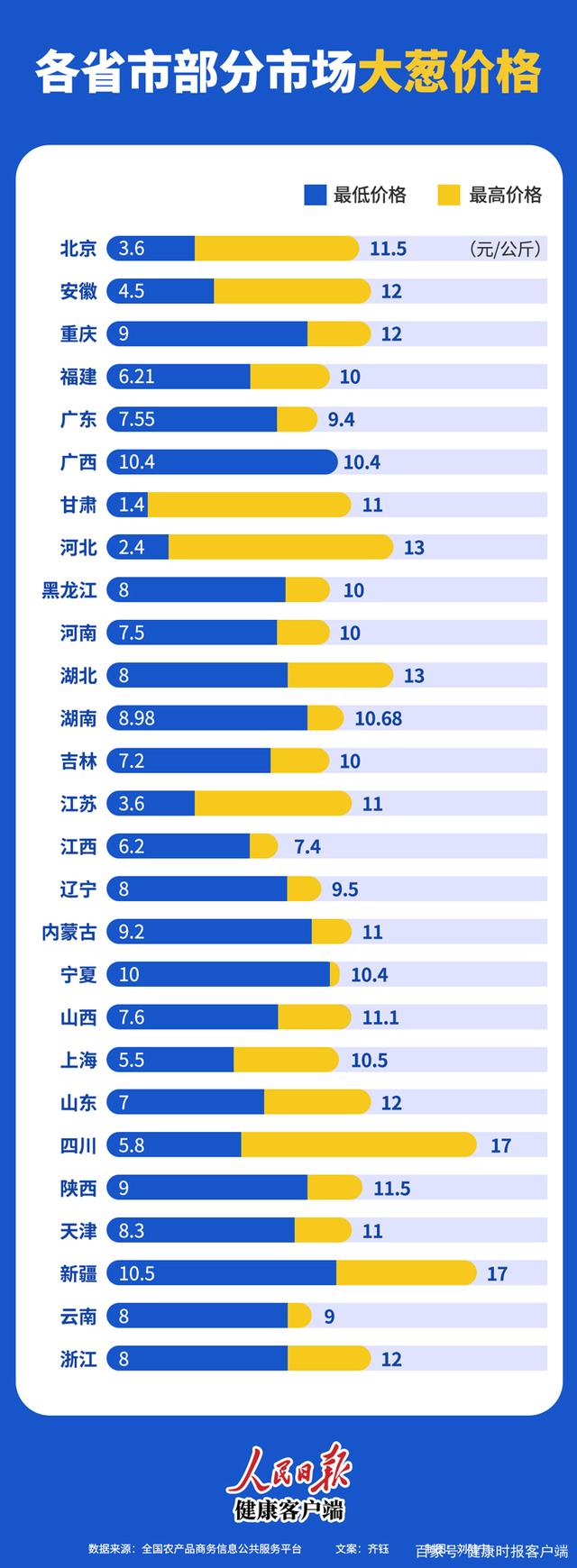 以山东省为例。以章丘大葱、安丘大葱、菏泽大葱闻名的山东省,大葱价格最高在每公斤12元,最低价格每公斤7元。山东章丘刁镇蔬菜批发市场,近一周内葱价维持在每公斤7元左右;山东省青岛市3个蔬菜批发市场,价格在8~12元/公斤左右;中国寿光农产品物流园在8.48元/公斤左右;威海市、德州市、滨州市则在10元/公斤左右。
