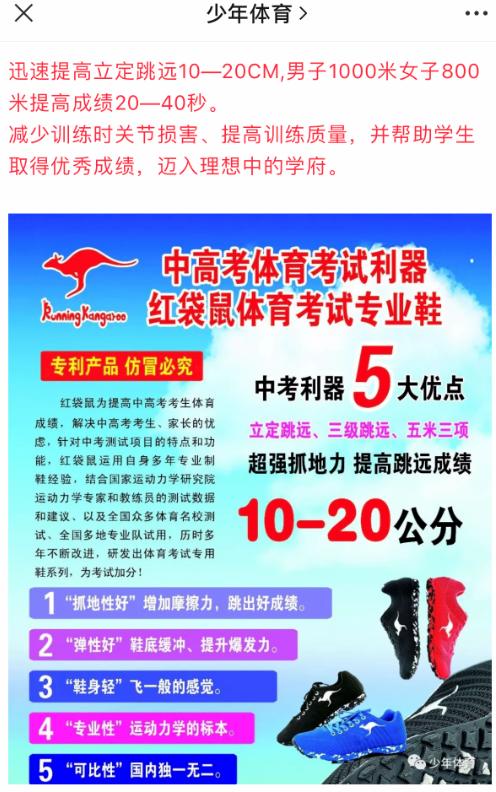 5月是北京中考体测的考试时间,最近,号称专门为体育中考量身定制的体测鞋受到了考生和家长的关注。从各大电商平台、微信公众号里铺天盖地的广告中可以看到,体测鞋被商家称为“提分黑科技”,不仅“跳远、跳绳、跑步都适用”,而且只要穿上就能“迅速提高体测成绩”,跳远成绩最高可提升25厘米,跑步成绩最高可提升40秒钟。