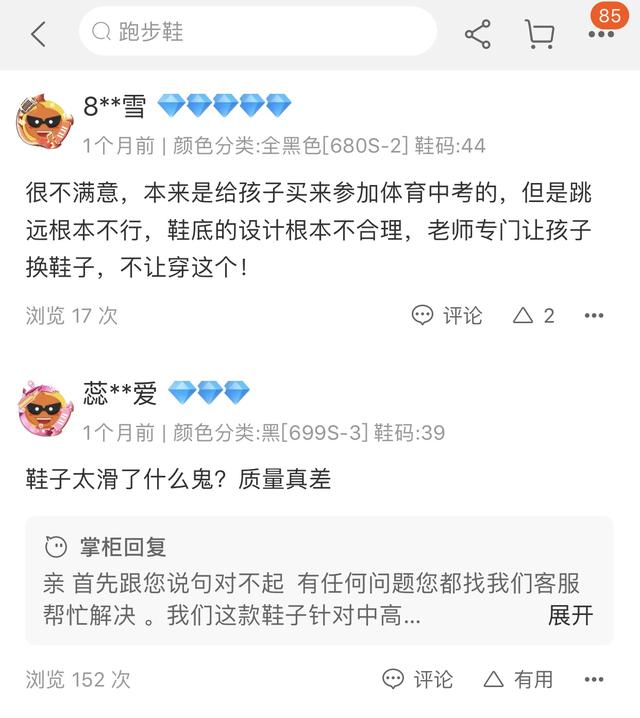 更令人担忧的是,一些中考体测鞋不仅无法达到提分效果,甚至还存在质量问题。有顾客表示:“买来跑了一下,鞋子直接开胶。”还有家长说:“鞋子很硬,正常抬脚走路都不太方便,我家孩子跳绳穿了十几分钟袜子就染上了黑色,体测鞋真是套路满满。”记者打开一款月销3000双体测鞋的淘宝店铺,同样看到有不少顾客评论该款体测鞋“鞋底滑”“不跟脚”“味道大”“网丝容易裂开”。