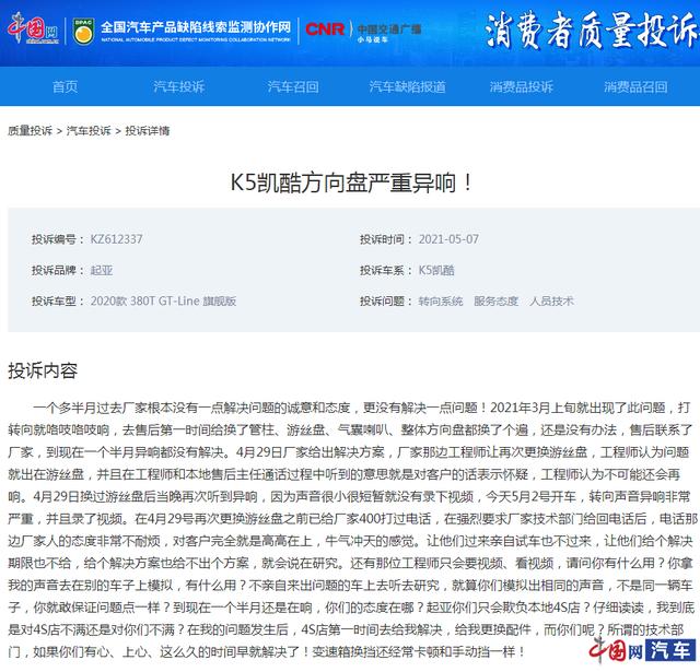 5月11日讯,车辆异响虽然听起来不是大问题,但如果异响严重,且屡修屡坏,将给车主带来极大的困扰,更可能将引发交通事故。近日,中国网汽车质量投诉平台就接到一位东风悦达起亚车主的投诉。
