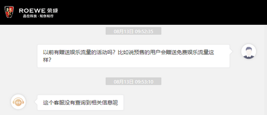 此外,《消费者报道》以普通消费者的身份咨询了上汽荣威的客服人员,对方明确表示对于“娱乐流量的赠送,客服这里没有相关信息”。而对于参加预售的客户能否获得免费赠送车联娱乐流量的优惠,上汽荣威的客服人员同样表示“没有查询到相关信息”。