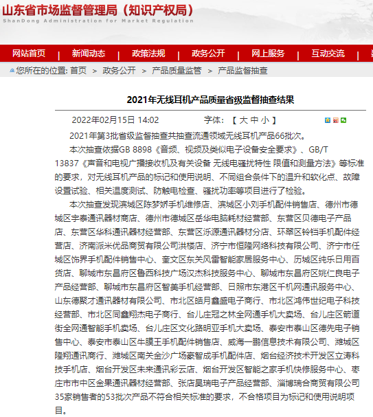北京2月17日讯 2月15日,山东省市场监督管理局网站公布了《2021年无线耳机产品质量省级监督抽查结果》。2021年第3批省级监督抽查共抽查流通领域无线耳机产品66批次。本次抽查发现滨城区陈梦娇手机维修店、滨城区小刘手机配件销售店、德州市德城区宇泰通讯器材商店等35家销售者的53批次产品不符合相关标准的要求,不合格项目为标记和使用说明项目。