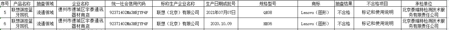 其中2批次不合格产品均为德州市德城区宇泰通讯器材商店销售的标称联想(北京)有限公司生产的联想颈挂蓝牙耳机,不合格项目均为标记和使用说明,生产日期或批号分别为2021年07月07日、2020.10.09,规格型号分别为QE08、HE06,商标均为Lenovo(图形),承检单位均为北京泰瑞特检测技术服务有限责任公司。