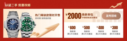在414手表节活动期间,万表二手表平台推出闲置名表在线回收服务,300+优质商家同台竞价,对比行业报价高20%。此外,用户发布并成功回收后即赠送至高2000元换新专属优惠券,让用户以闲置旧表即可换取心仪新表。
