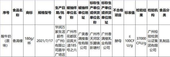 根据公示的抽检信息,华润万家生活超市(广州)有限公司嘉华广场店销售的、标称由广州香满楼乳业有限公司生产的一批次酸牛奶(原味)产品经广州检验检测认证集团有限公司检测被抽检出酵母含量为37000CFU/g,标准限量为100CFU/g,超标360倍。