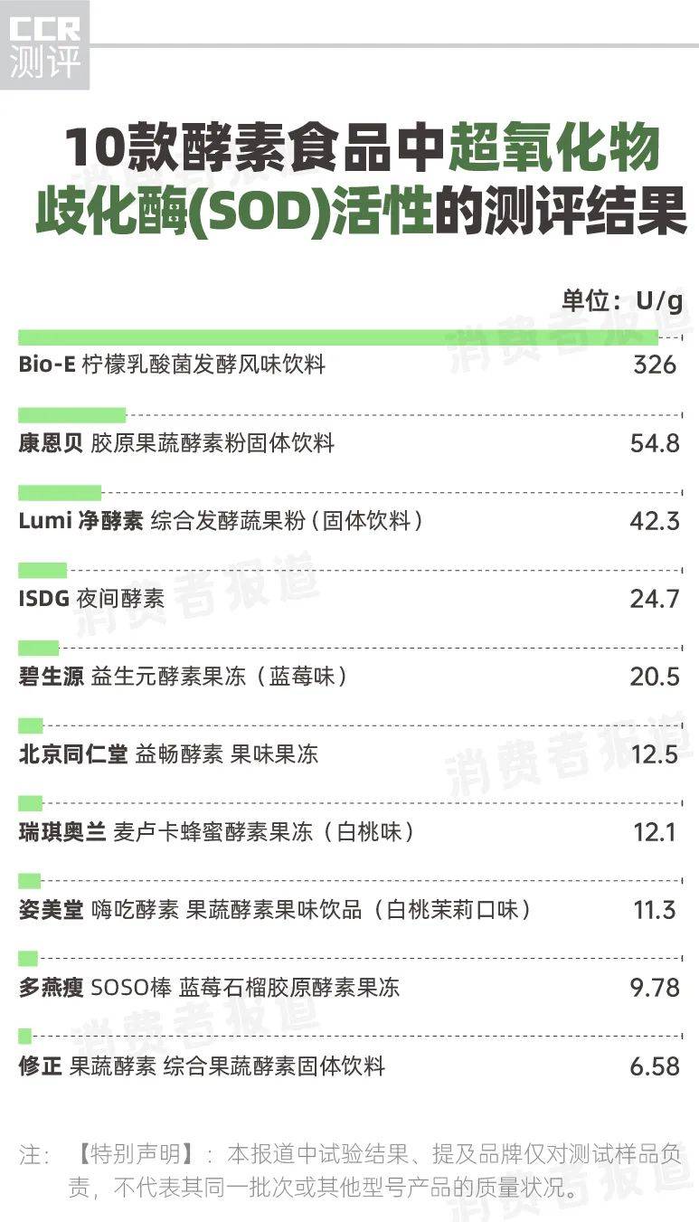 文献资料显示,在黄瓜、玉米、苹果、香蕉等20种常见的蔬菜、水果中,SOD酶活性的平均值为427.5U/g,高于此次测评的10款酵素。