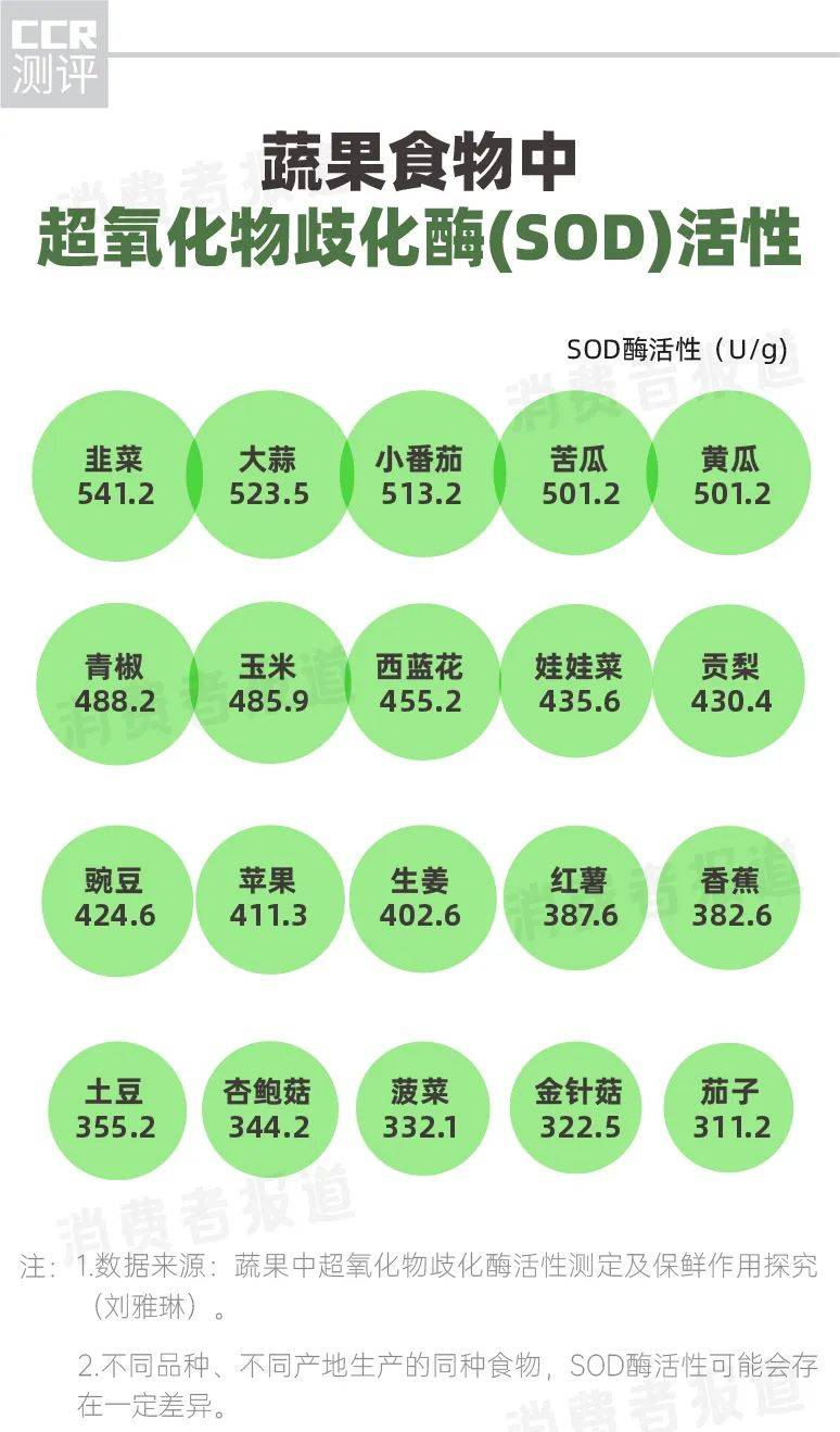 以修正为例,一克果蔬酵素综合果蔬酵素固体饮料含SOD是6.58个活性单位,而一克韭菜和一克大蒜中SOD的含量分别为541.2个活性单位和523.5个活性单位。