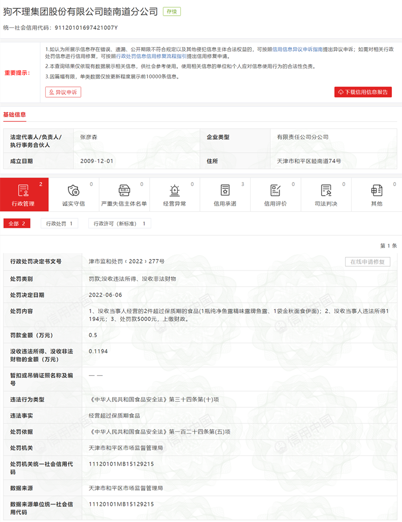 6月10日讯,据信用中国网站消息,近日,狗不理集团股份有限公司睦南道分公司因经营超过保质期食品遭罚款5000元,处罚机关是天津市和平区市场监督管理局。